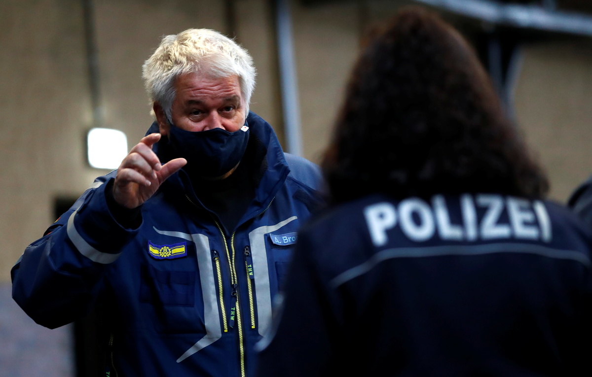 Albrecht Broemme, project manager for vaccination centres and honorary president of the Federal Agency for Technical Relief (THW) talks to a police officer during a planing meeting for an upcoming coronavirus vaccination center at Arena Berlin event hall, as the spread of the coronavirus disease (COVID-19) outbreak continues, in Berlin, Germany, November 21, 2020. REUTERS/Fabrizio Bensch