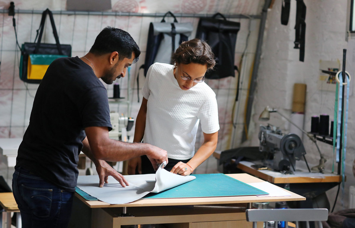 In Mimycri's Berlin workshop, Ali carefully measures out a large piece of rubber on a workbench before cutting it precisely to size and skillfully using a sewing machine to craft a bag.