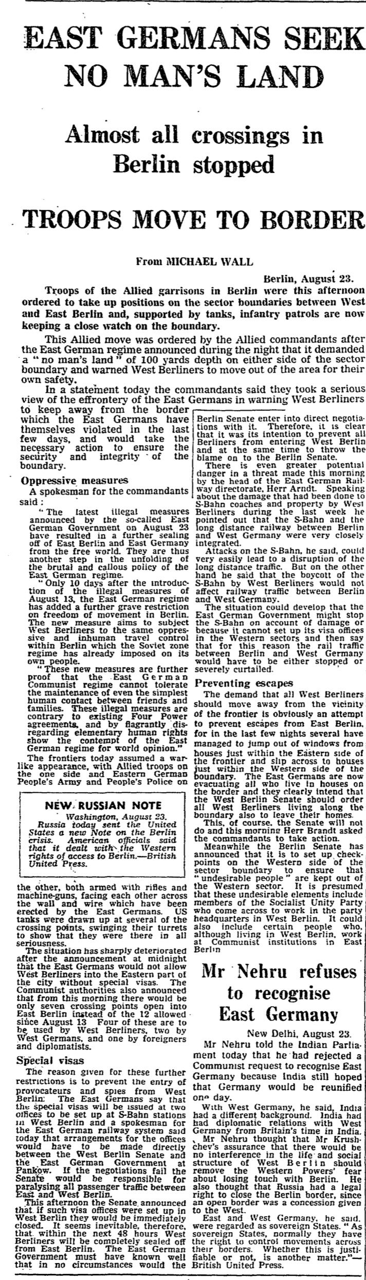 The demand that all West Berliners should move away from the vicinity of the frontier is obviously an attempt to prevent escapes from East Berlin, for in the last few nights several have managed to jump out of windows from houses just within the Eastern side of the frontier and slip across to houses just within the western side of the boundary. The East Germans are now evacuating all who live in houses on the border and they clearly intend that the West Berlin Senate should order all West Berliners living along the boundary also to leave their homes.