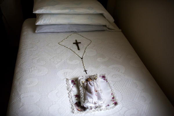 At 3 a.m., Calderon wakes up to use the bathroom. Socorro helps her to the commode beside the bed, then tucks her back in. As Calderon falls back to sleep, the sister opens her copy of a book written by Pope Francis.