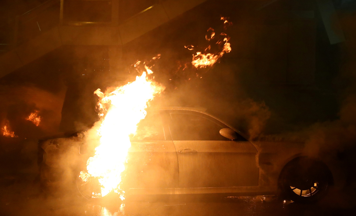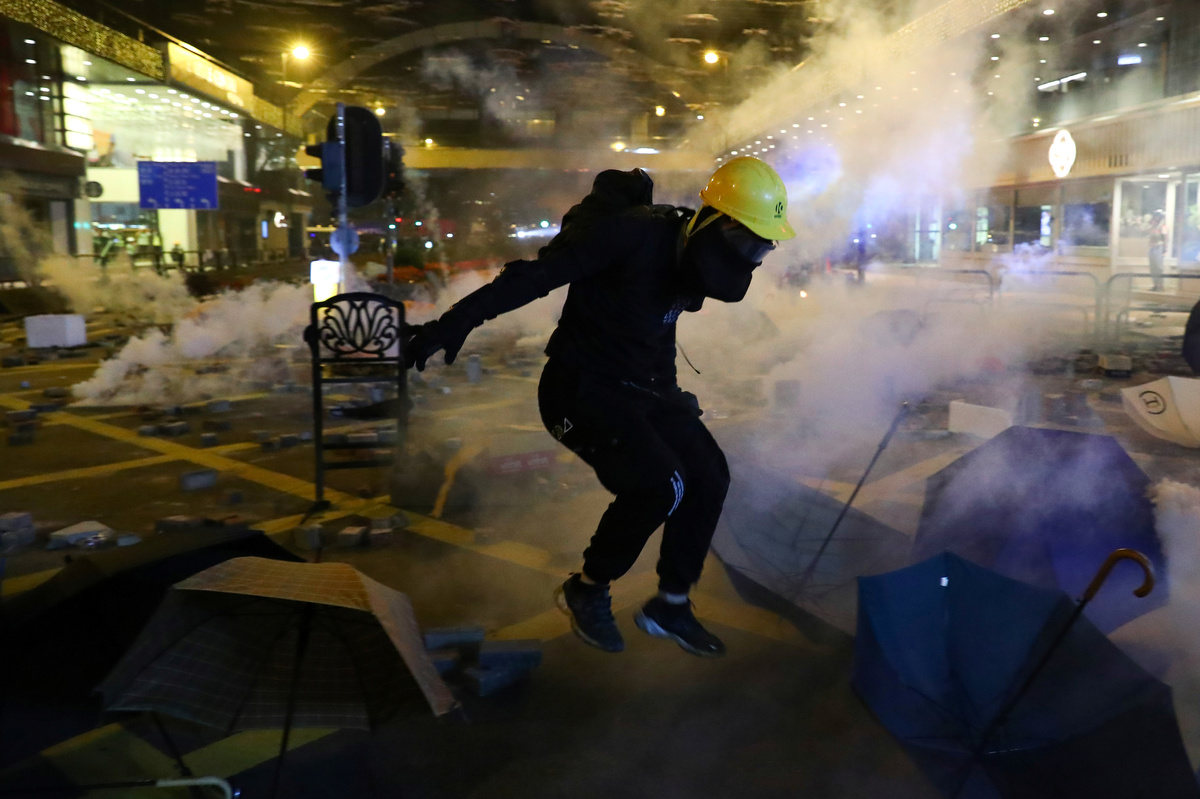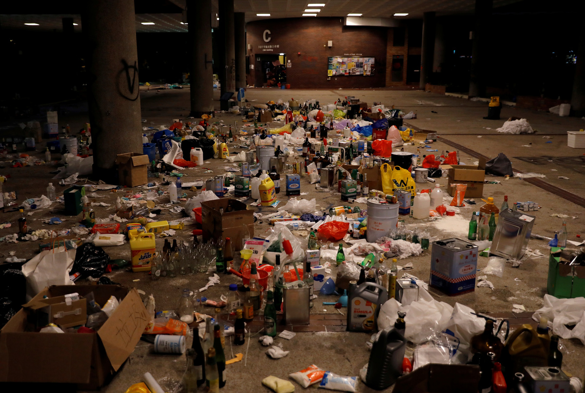 As he spoke, big explosions were heard and flames flared up at a distant part of the campus. In streets nearby, protesters rained down petrol bombs, burning parked cars and the front of a Standard Chartered Bank branch.
