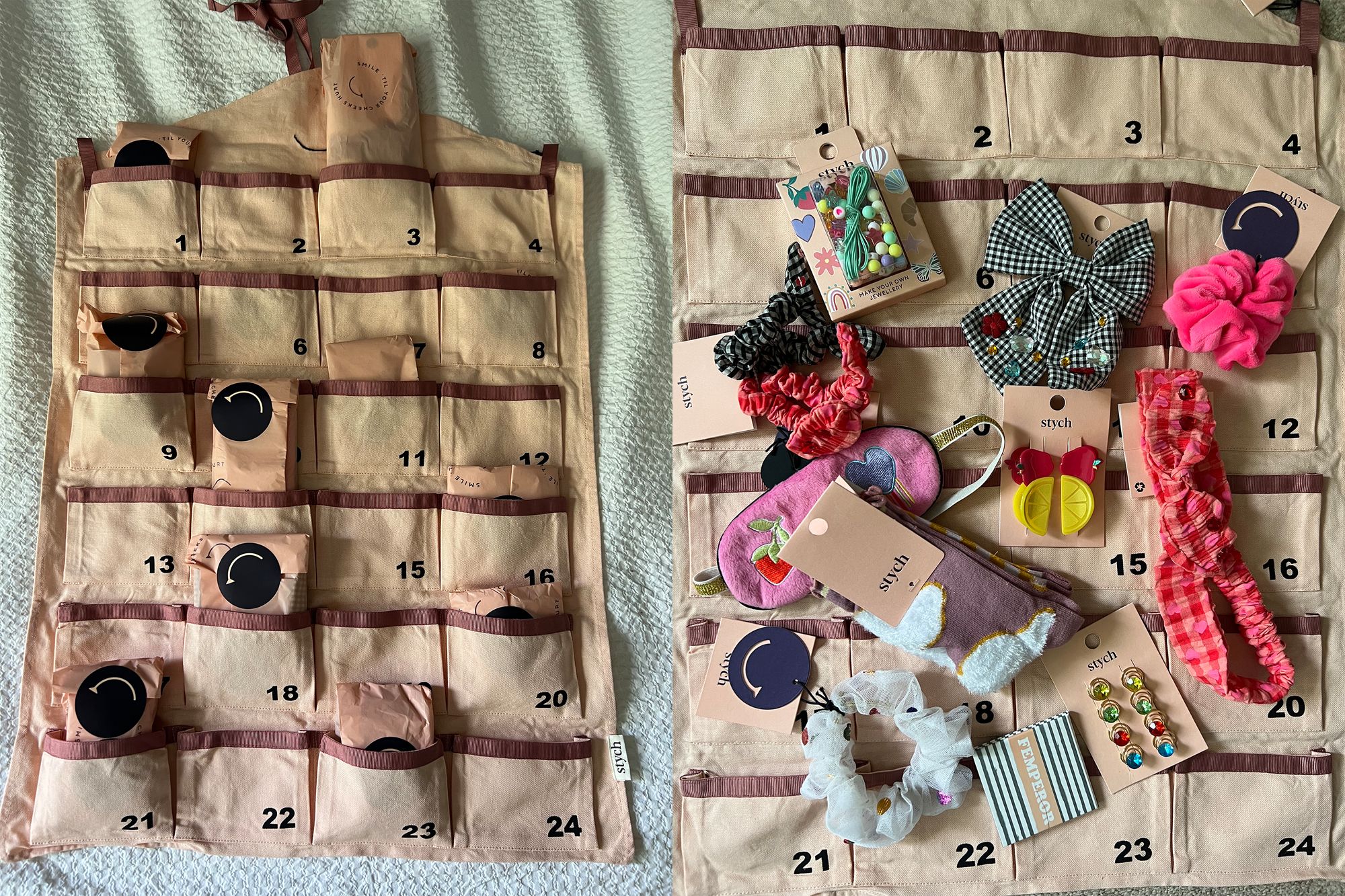 Excitement levels went through the roof when my tester got her hands on this gorgeous advent calendar from Stych. Inside the 24-pocket reusable pink fabric advent calendar are 12 stylish accessories, including everything from socks and sleep masks to oversized hair bows and sparkly scrunchies.