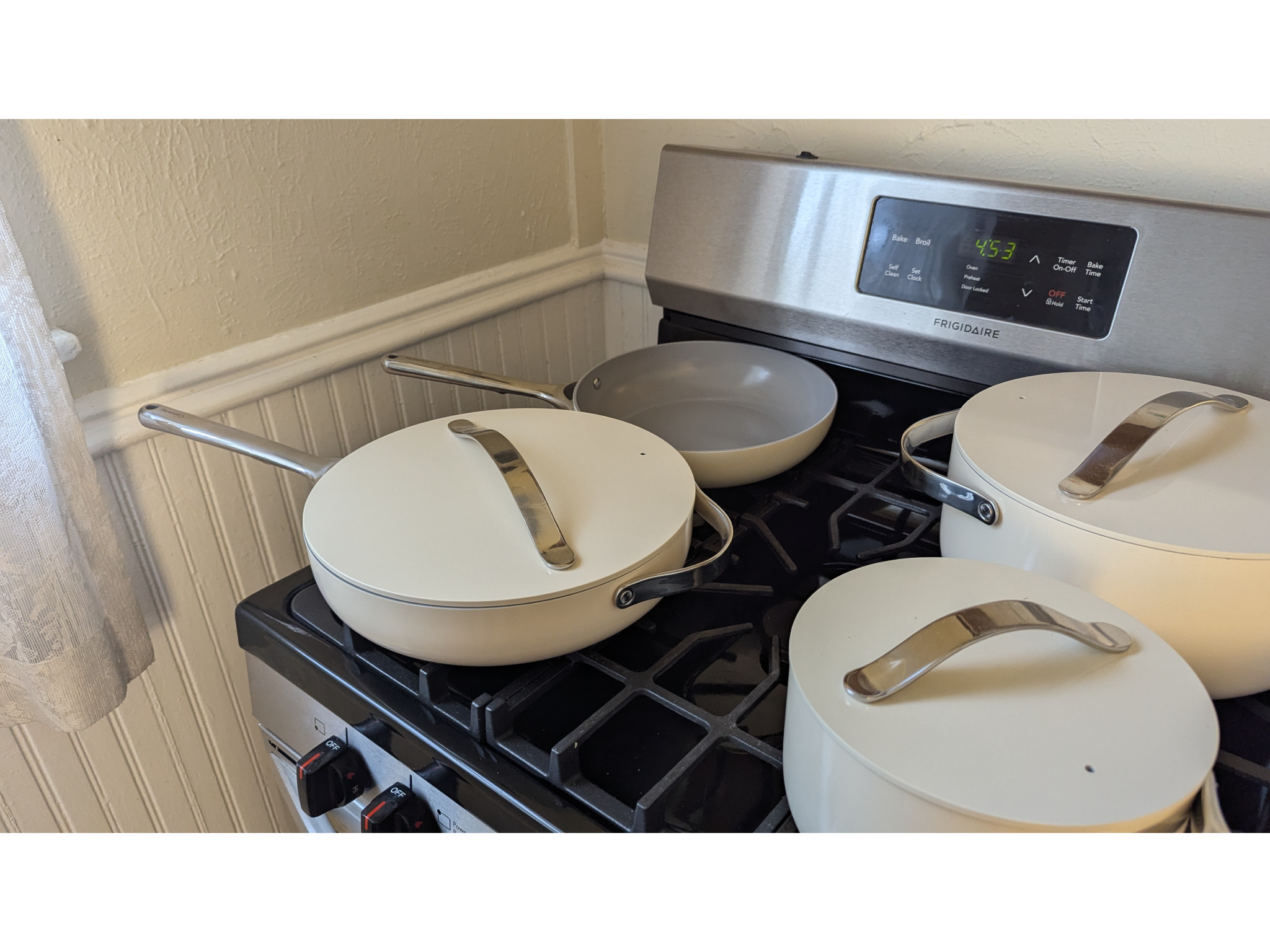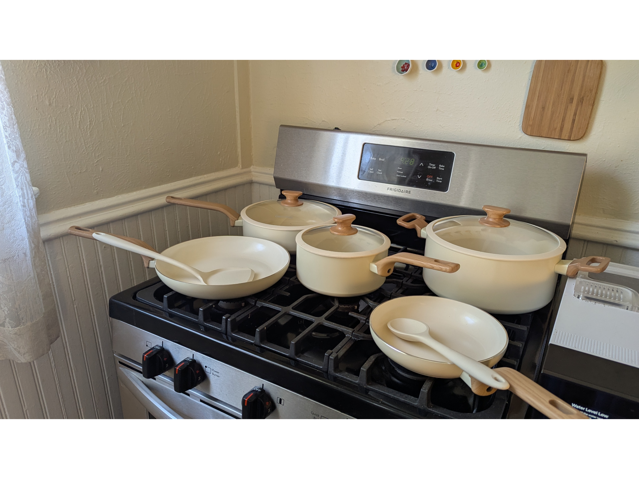 Cooking and cleaning also required some patience. That said, it comes with six different pots and pans, as well as a steamer insert, and, like Caraway’s set, the cookware is oven-safe up to 550 degrees.
