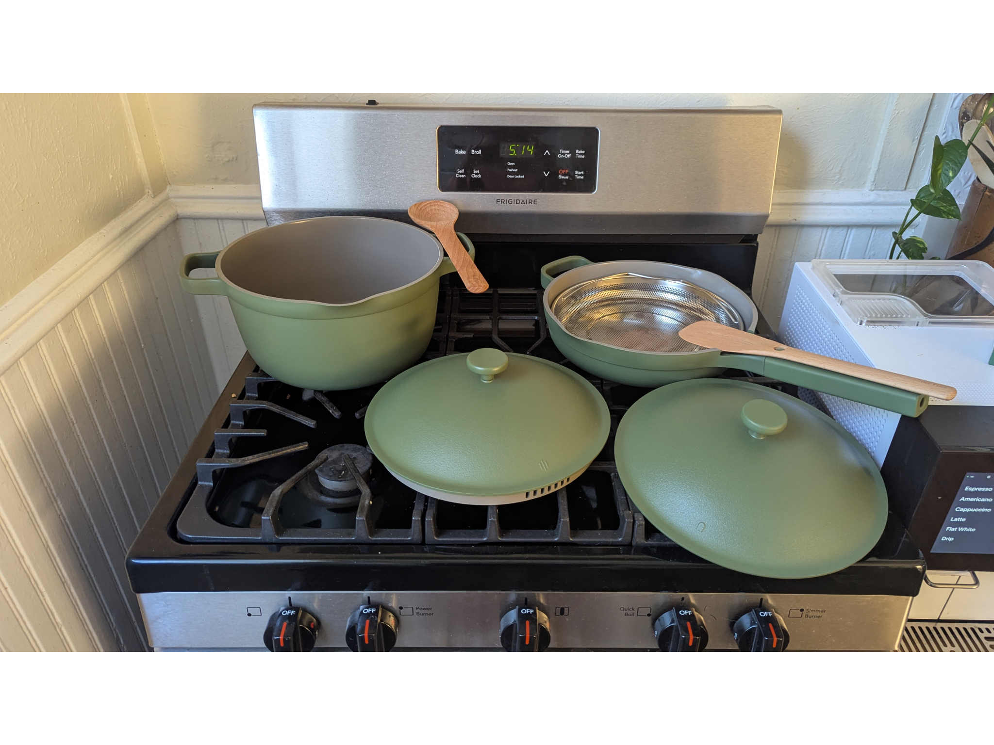 Considering the price and that it can replace up to 18 pieces of cookware, Our Place’s cookware duo is the most versatile set I tested. When testing, I braised, seared, steamed, strained, sautéed, fried, boiled, and baked with this pan and pot duo. Even the wooden spoons included in the purchase made flipping food without scratching the ceramic surface easy.
