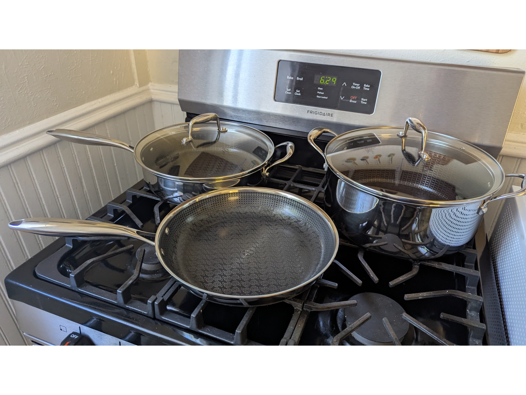 With the Hell’s Kitchen hybrid five-piece set, you can ultimately cook meats and vegetables without the learning curve that is required when cooking on a stainless steel set (though, to be fair, you get a better sear with stainless steel cookware). Perhaps the most surprising thing about this set is that it's oven-safe up to 900 degrees. Even the glass lids can handle up to 500 degrees. That’s a huge win in my book.