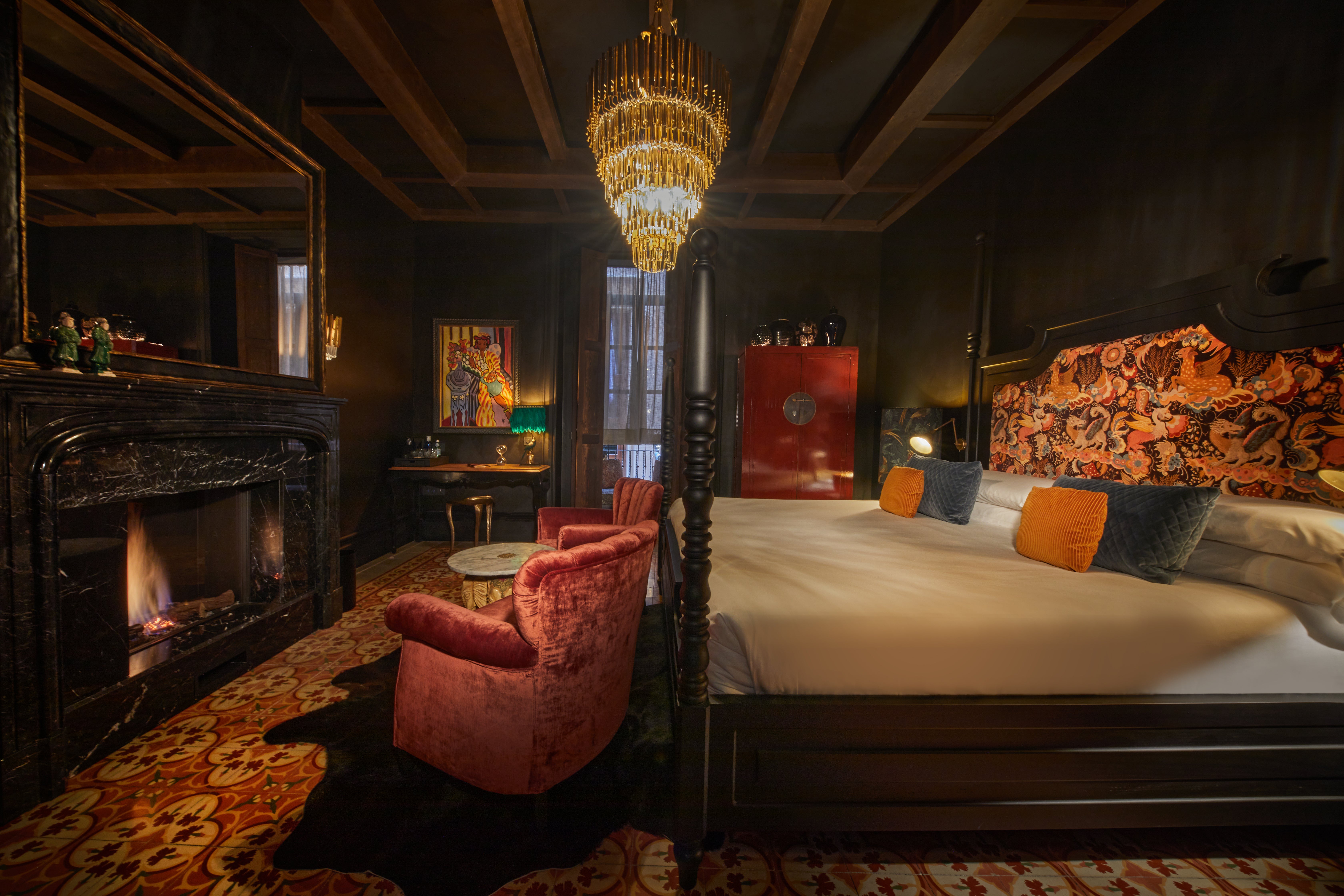While the hardwood and tile floors and impossibly high ceilings hint at this old Mallorquin home’s history, the rooms explode into maximalist fantasy, with jewel-toned velvets, black walls, and pattern-heavy upholstery that create a sumptuous stay unlike any other on the island. Mirrored ceilings, a palm tree lamp with feathers for fronds, brass and marble fireplaces are just some of the unique touches in the spacious rooms. There are nods to modern luxury, too, including GHD dryers and curlers and a menu of Molton Brown scents that get decanted into tasselled vials for your nightly use.