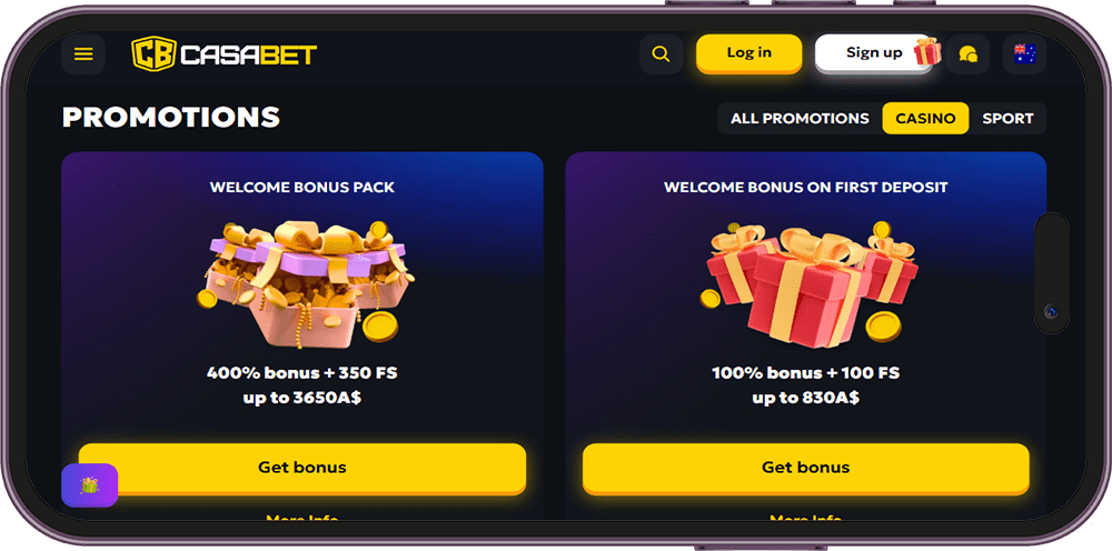 Casabet rolls out a five-part welcome package that totals up to A$3,650 and 350 free spins. Each bonus has a 40x wagering requirement for deposit matches and a 35x requirement for free-spin winnings. Withdrawals from bonus funds are capped at five times the bonus granted, and free-spin winnings can’t exceed A$165. Beyond the welcome offer, Casabet keeps players engaged with a daily cashback of up to 35%, VIP gifts, and frequent provider tournaments with large prize pools.