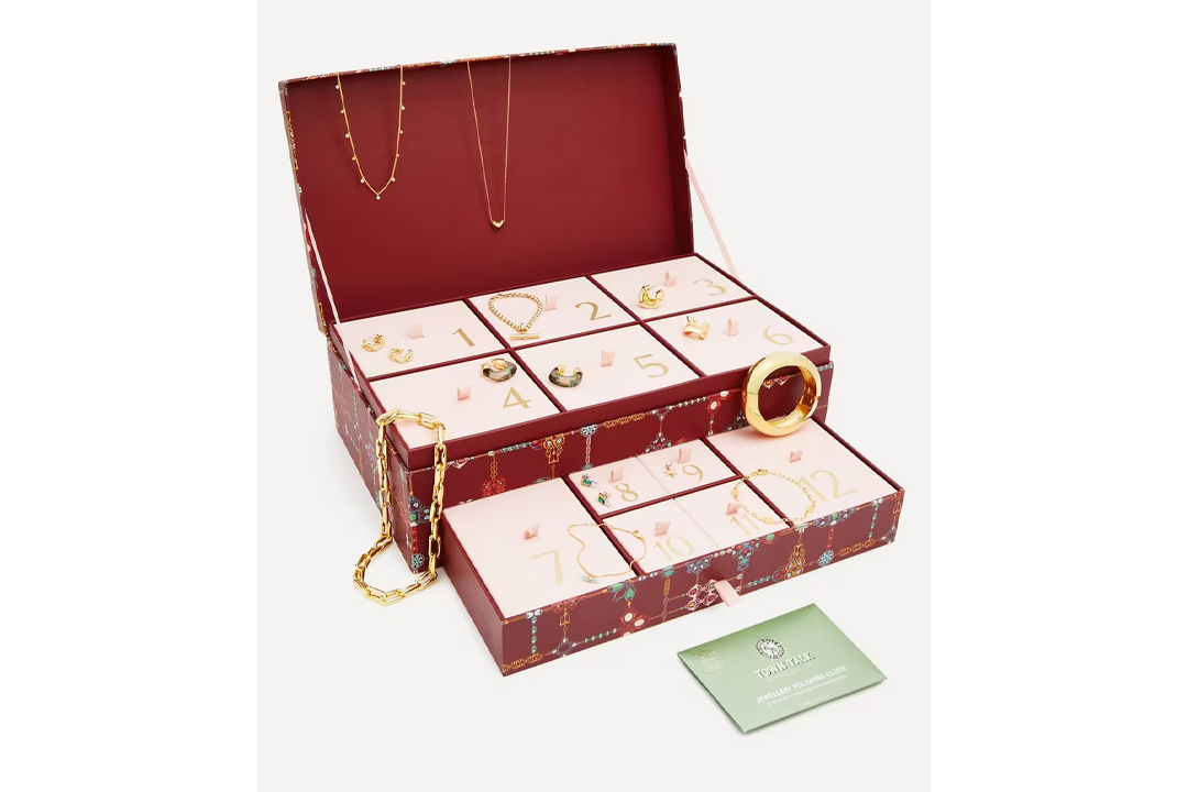 Joma’s 12-day advent calendar offers a glamorous countdown that’s packed with a choice of sterling silver or gold pieces. On sale for £179, the contents inside boast an overall value of £300. Packaged in a durable cream box that can be reused as a trinkets tray (complete with leather straps for earrings), the numbered boxes reveal everything from star-adorned bracelets to heart charm necklaces, sparkly stud earrings, adjustable rings and glittery small hoops.