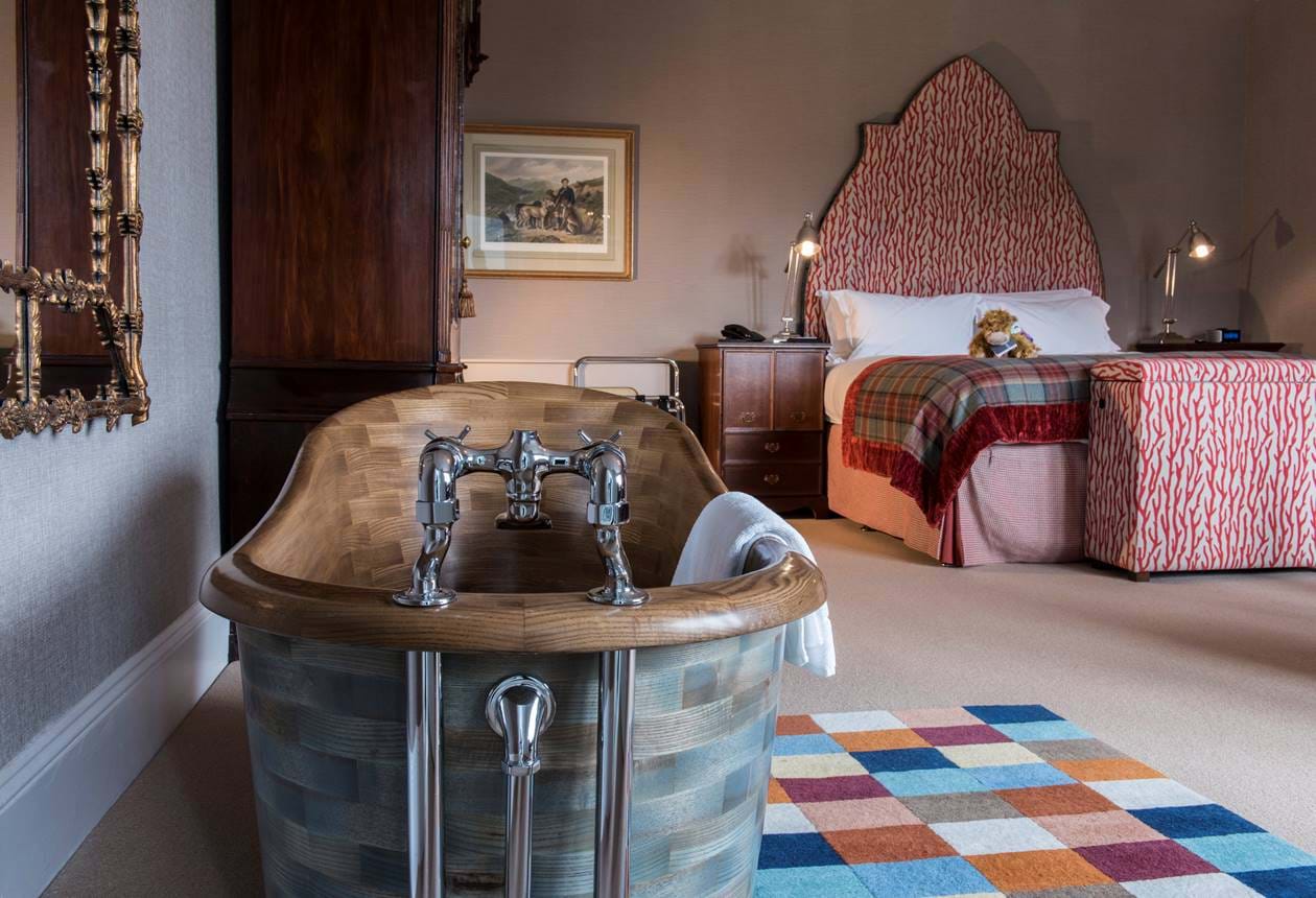 The Schloss Roxburghe is housed in the grand old country house of the Duke of Roxburghe, one of Scotland’s richest figures. It underwent a massive revamp in 2023 that has since elevated it to one of the most luxurious hotels in the country. All 78 rooms and suites are bathed in luxurious fittings with decadent textiles, beautiful colours and sumptuous fabrics. Opt to stay in the main castle or one of the self-catering cottages dotted around the expanse of grounds. Food and drink options are excellent, as are the leisure facilities, but the highlight is the outdoor swimming pool with its adjacent hot tubs; swimming from inside to out is a sublime experience. A close second and third is playing golf on the estate around the hotel, or fishing, which is great fun for all the family.