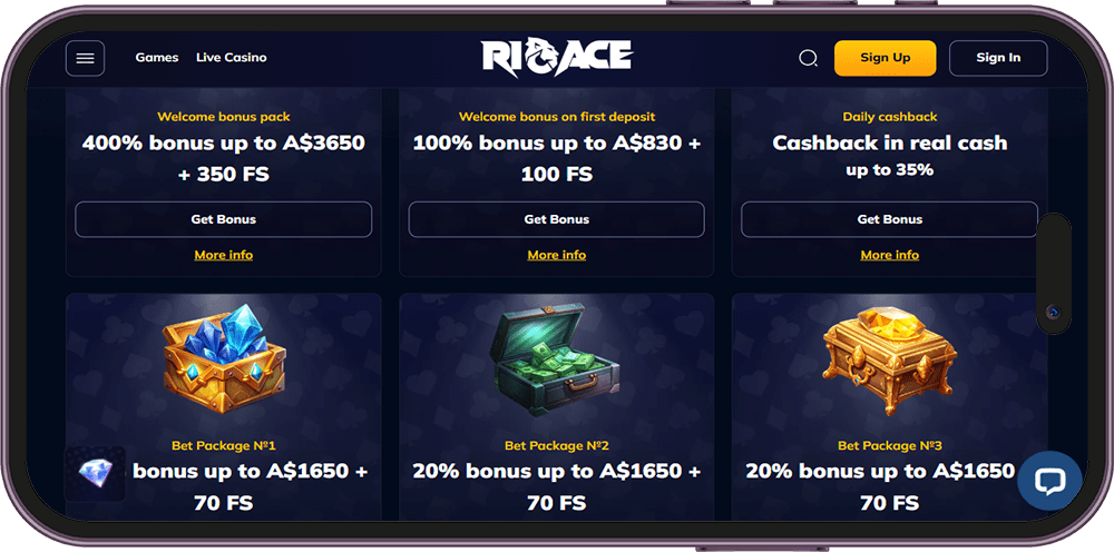 - Welcome bonus: The welcome bonus is the headline offer at almost every site. It matches a percentage of your first deposit, so you start with a bigger bankroll and sometimes free spins. For example, Rioace offers a five-part welcome package worth up to A$3,650 plus 350 free spins, while Casabet’s equivalent reaches the same total with similar terms.