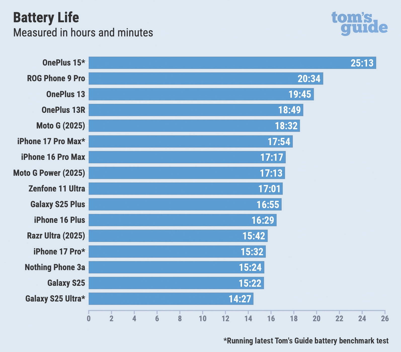 All of the phones in the chart were run using a previous version of the test, while newer ones like the OnePlus 15, iPhone 17 Pro Max, iPhone 17 Pro, and Galaxy S25 Ultra use the latest version.