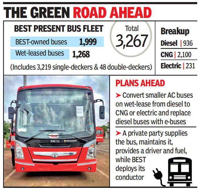 Another environment-friendly move by BEST will be to bring in more CNG or electric buses rather than diesel on wet-lease, where a private party supplies the bus, maintains it, provides a driver and fuel, while BEST deploys its conductor and has 100% rights over the earnings from operating it.