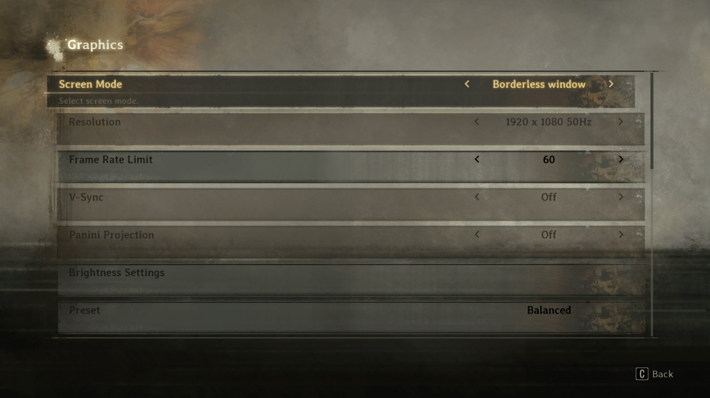 - Screen Mode: Fullscreen (I use Borderless Window due to my multi-screen setup)