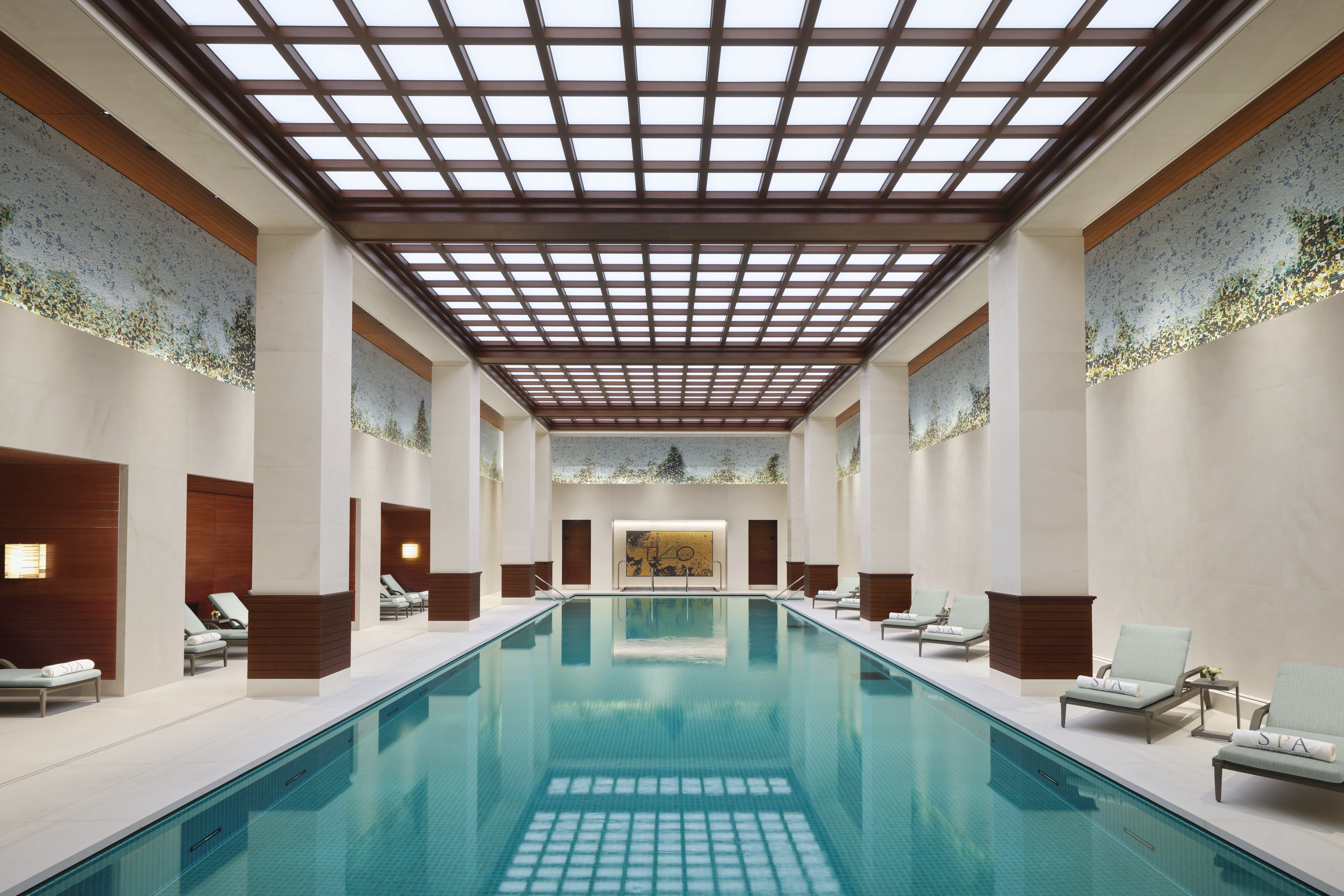 Thirty years in the making, and built from the ground up in Belgravia, the Peninsula London raised the capital’s luxury hotel bar when it opened in 2024. Its 25-metre pool is rather special, as it’s not only one of London’s longest luxury hotel swimming pools, but it’s housed in the property’s atmospheric subterranean spa. Designed by acclaimed architect Peter Marino, the space has a double-height ceiling with clever illuminated panels that phase through differing levels of light throughout the day, mimicking the sun’s natural path and intensity. Walls decorated with mosaic artwork resemble the treelines of neighbouring Hyde Park.