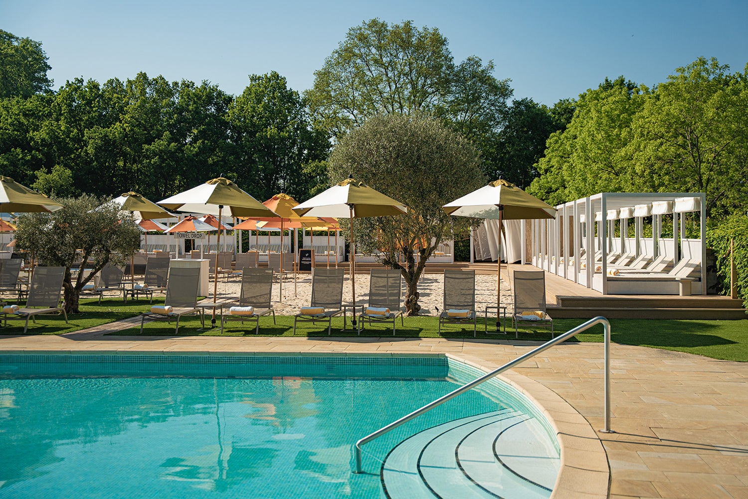 Overlooking oak-filled gardens, which spill down to 3,000 acres of parkland, and with scallop-edged parasols in terracotta and cream stripes lining its south-facing terrace, the 25 metre pool at Estelle Manor in Oxfordshire nails Riviera finesse and rural glamour in one fell swoop. Given the hotel comes from the team behind exclusive private members’ club Maison Estelle on Mayfair’s Grafton Street, it’s no surprise that the pool experience at this handsome Jacobean manor house is just so.