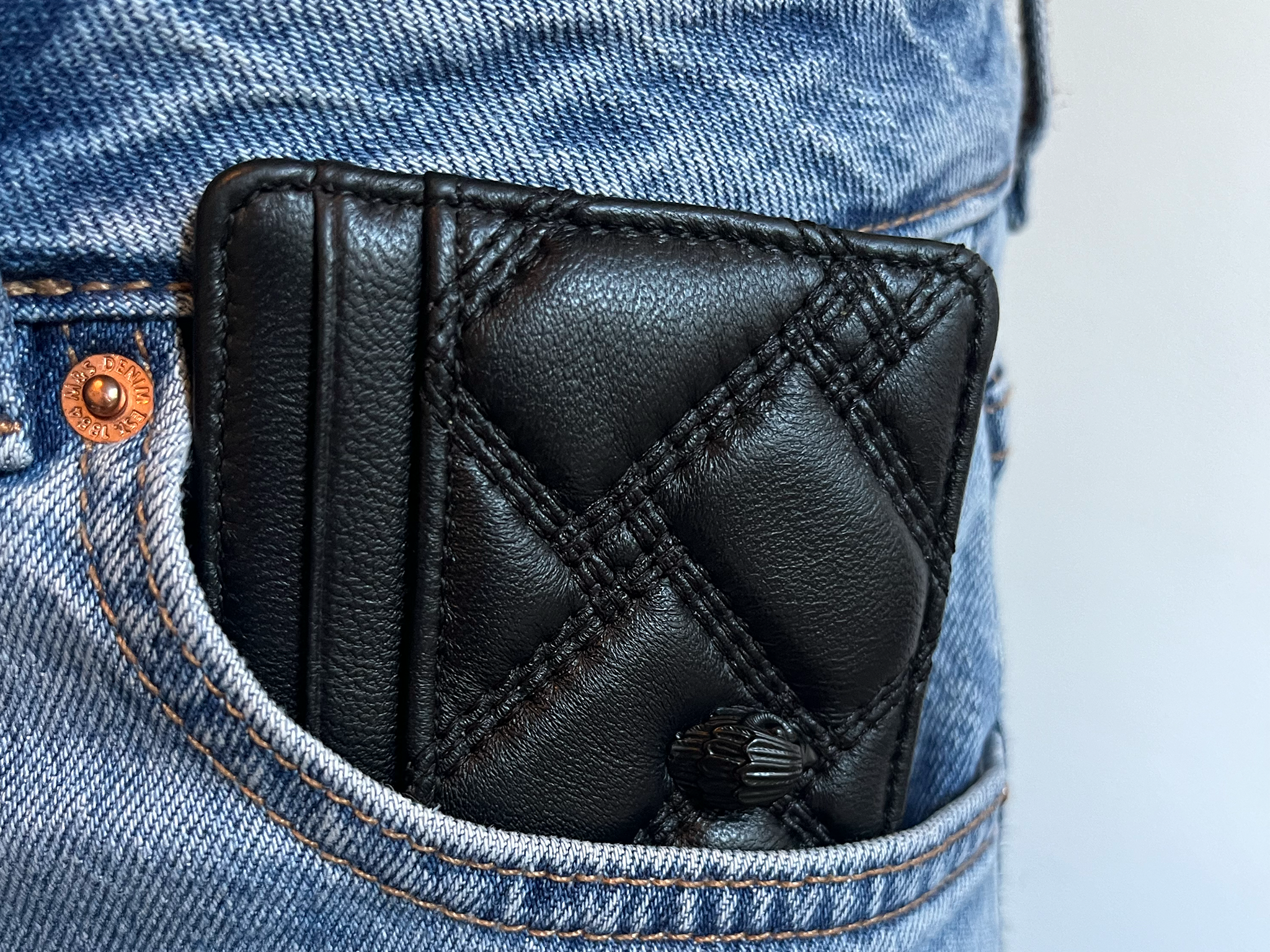 While Kurt Geiger is renowned for its unique, colourful and quirky designs, this all-black card holder owes its flair to the puffy quilted pattern and three dimensional eagle's head branding. I also like that the design is tactile, making it more secure in the hand, and quite satisfying to hold.