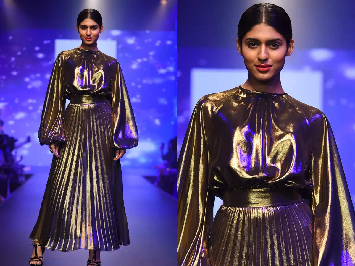 Another stunning ensemble from Gauri & Nainika\'s show was this metallic dress with a knife-pleat skirt.