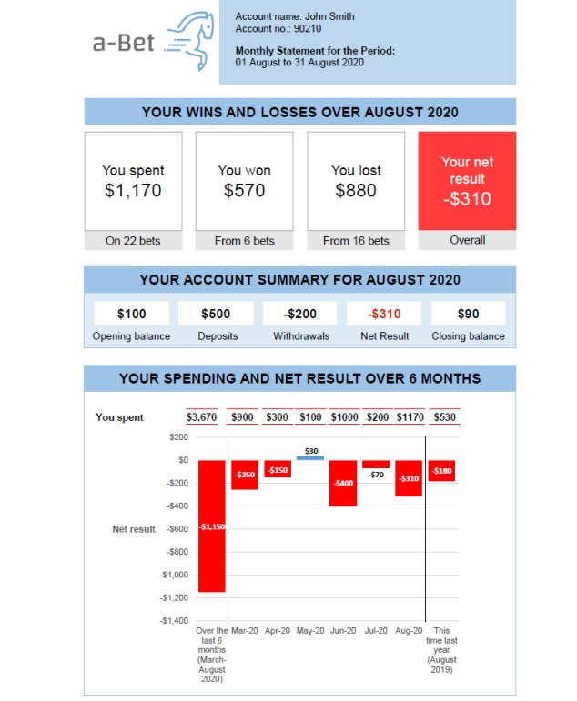 With Australian gambling losses among the highest per capita in the world, the new monthly activity statements are intended to help gamblers make better decisions by providing a clear picture of their spending.