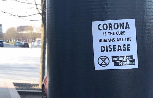 Posters in the style of the activist group Extinction Rebellion (XR) have appeared in the UK declaring “Corona is the cure, humans are the disease”. A now-deleted tweet from @xr_east had photos of the poster, under the line that “Earth is healing. The air and water is clearing”.