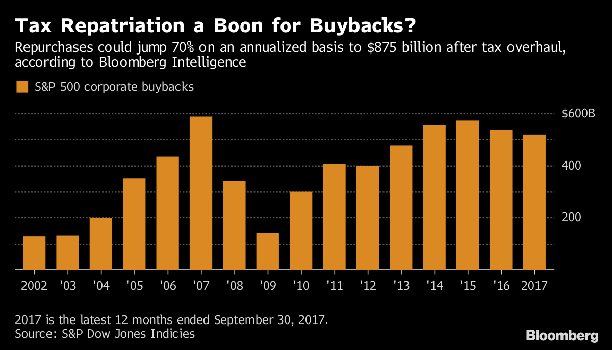 According to a recent study by Bloomberg Intelligence, the tax overhaul could lead to buybacks jumping by more than 70 percent on an annualized basis to $875 billion. The analysis was based on the growth in completed repurchases in 2004-2005, the last time a tax repatriation holiday was in place.