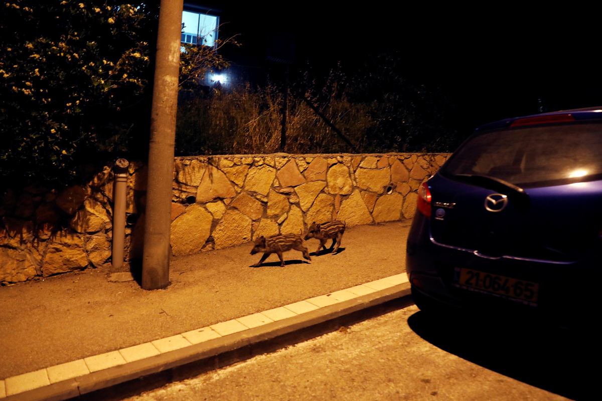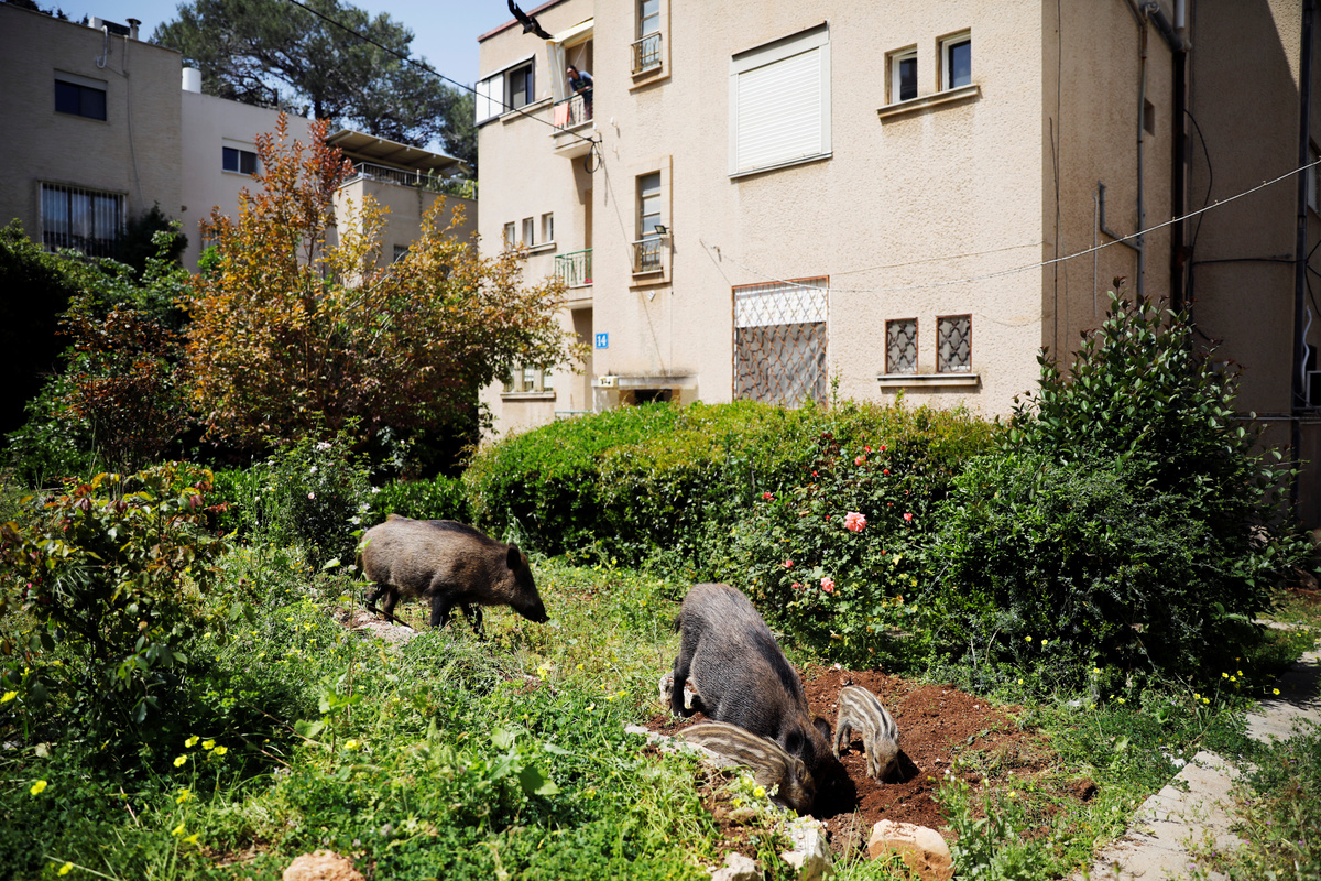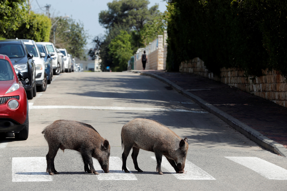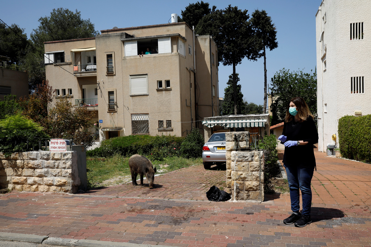A woman stands next to a wild boar roaming in a residential area after the government ordered residents to stay home to fight the spread of coronavirus disease (COVID-19), in Haifa, northern Israel April 16, 2020. REUTERS/Ronen ZvulunA woman stands next to a wild boar roaming in a residential area after the government ordered residents to stay home to fight the spread of coronavirus disease (COVID-19), in Haifa, northern Israel April 16, 2020. REUTERS/Ronen ZvulunWild boars roam next to a residential building after the government ordered residents to stay home to fight the spread of coronavirus disease (COVID-19), in Haifa, northern Israel April 16, 2020. REUTERS/Ronen ZvulunYoung wild boars walk at a street in a residential area after the government ordered residents to stay home to fight the spread of coronavirus disease (COVID-19), in Haifa, northern Israel April 16, 2020. REUTERS/Ronen ZvulunWild boars roam next to a residential building after the government ordered residents to stay home to fight the spread of coronavirus disease (COVID-19), in Haifa, northern Israel April 16, 2020. REUTERS/Ronen ZvulunWild boars roam next to a residential building after the government ordered residents to stay home to fight the spread of coronavirus disease (COVID-19), in Haifa, northern Israel April 16, 2020. REUTERS/Ronen Zvulun