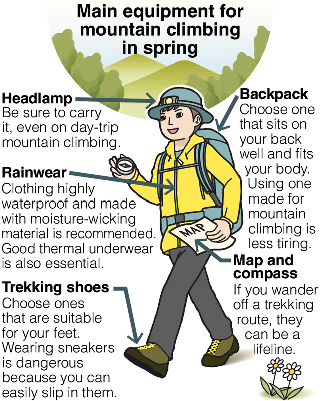 "The temperature falls by about 0.6 C for every 100 meters you climb. When the wind speed rises by one meter [per second], the temperature you feel falls by 1 C," said Gota Isono, head of the Japan Mountain Guides Association. "Mountaineering in spring is popular because climbers can enjoy seeing fresh greenery, cherry blossoms and other flowers, but the weather near mountain summits is the same as in winter."