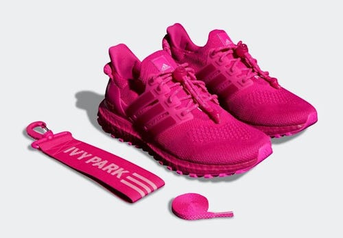 Front and center in the collection is a hot pink Adidas UltraBoost sneaker. It’s presented in a similar color palette to Nike’s Valentine’s Day Air Force 1 but bears the same principle design as previous Ivy Park UltraBoosts. Speckled white and hot pink laces are secured with a cord lock and mirror the coiled lace heel tab. A bigger, removable clip heel tag with “Ivy Park” spelled in pastel pink and alternating “Ivy” and “Park” on each toe serve as branding.