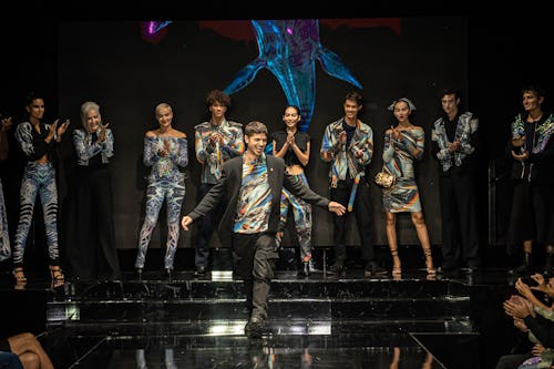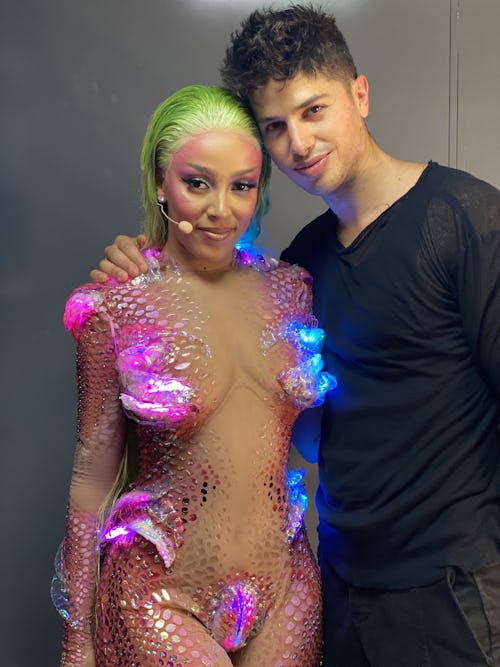 Over the past decade, the designer has made himself the go-to contact for anyone looking to flirt with the future, asking his clients how they choose to express and reflect technology’s presence within fashion. At 33, he’s already created a number of iconic outfits, including the renaissance-esque robot suit Lady Gaga wore during her 2018 “Enigma” residency, Doja Cat’s “alien fish goddess” look at the 2020 VMAs, and the luminescent bodysuit Lil Nas X wore in his headline-making “Call Me By Your Name” music video.