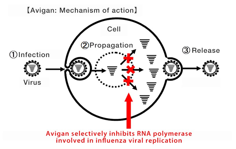 Favipiravir is an antiviral drug developed in Japan, where it is used to treat the flu. The drug attacks the molecular machinery the coronavirus needs to replicate once inside the cell.
