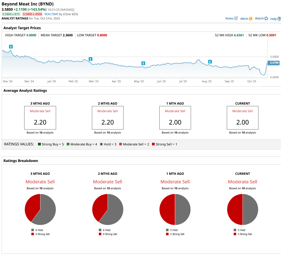 Out of the 10 analysts covering BYND stock, five recommend “Hold” and five recommend “Strong Sell.” The average stock price target is $2.36, which is below the current price of about $3.50.