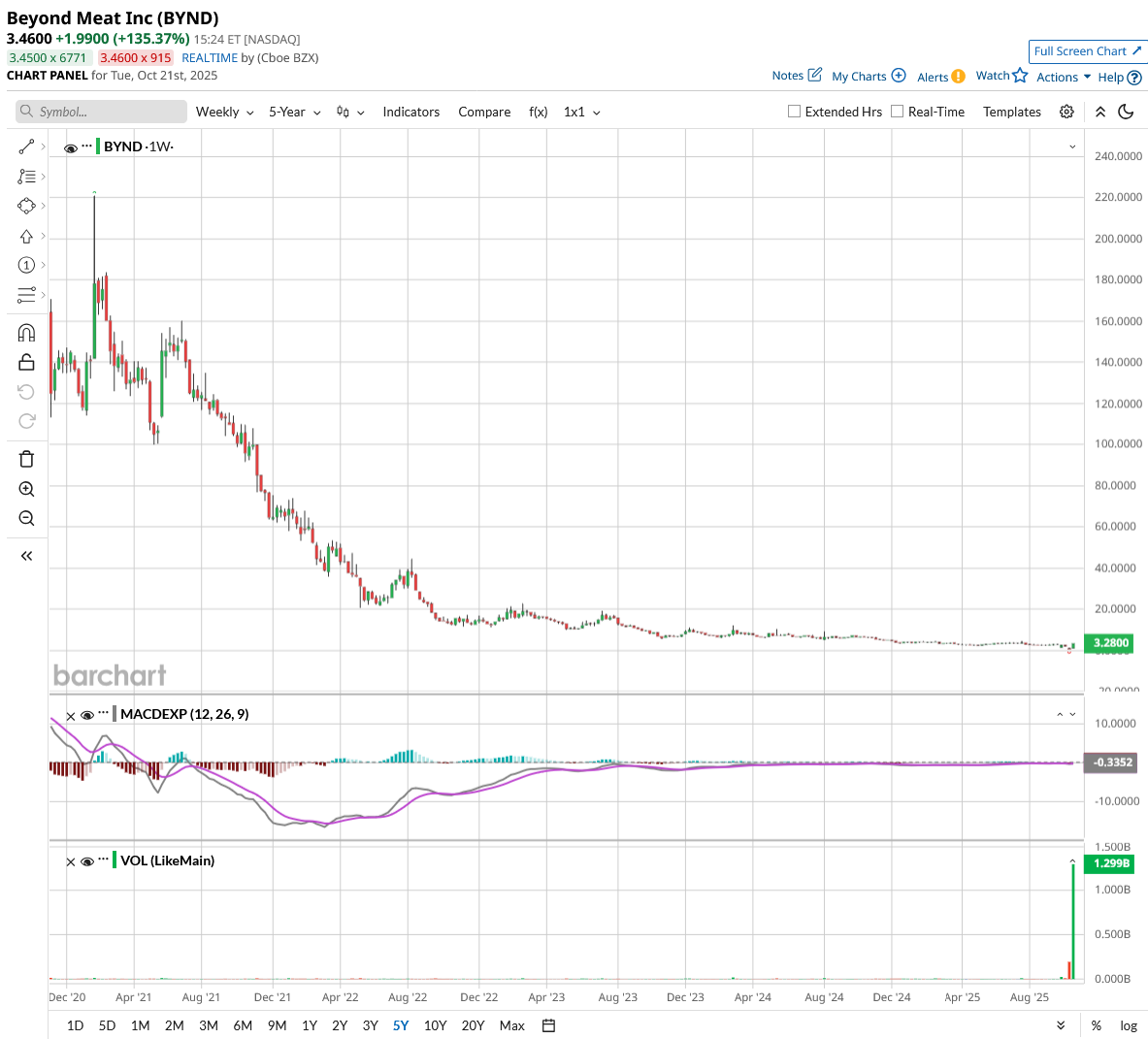 Beyond Meat (BYND) stock has become the latest meme stock sensation, as it surged over 80% in a single trading session yesterday despite Wall Street's negative outlook. The plant-based meat maker's shares jumped from around $0.65 to $1.19 as retail investors piled in, driving trading volumes to 31 times the three-month average. Today, BYND stock jumped another whopping 135% to around $3.50. Short interest sits above 51%, creating the perfect setup for a squeeze that retail traders love to exploit.