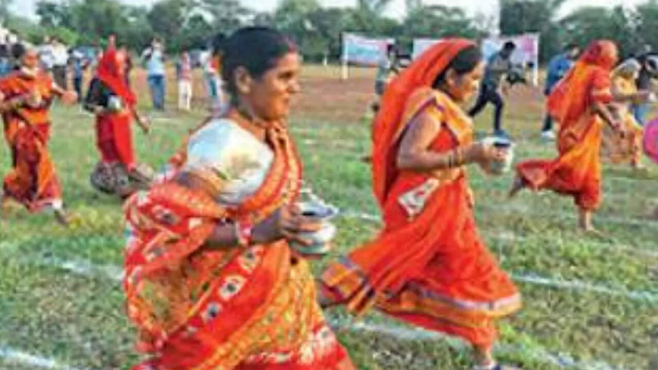 The runners carried a "lota" (utensil carrying water) in their hands and at the finish line, they poured water out, signifying that the compulsion to go to fields for defecation is now over. Their daughters-inlaw waited for them at the finish line to welcome them.