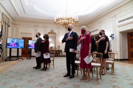 Biden, Harris and family members watched the service on multiple TV screens in front of a fireplace in the White House’s State Dining Room, standing as the national anthem was sung by Patti LaBelle.