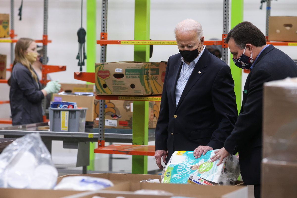 At the Houston Food Bank, the largest in the country serving more than 1.1 million people, Biden saw rows of packaged food, from pasta to applesauce, stacked in a large warehouse and watched conveyors move slowly as volunteers pulled food out of boxes and put them in containers for delivery.