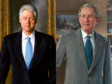 The former president had the portraits replaced by those of two Republican presidents who served more than a century ago sometime after 8 July, while reports said Mr W Bush and Mr Clinton took place in a small room that is not seen by most visitors.