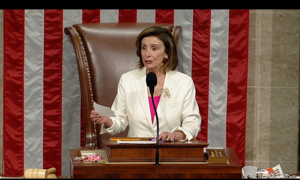 Speaking at the close of debate after the House gaveled back into session on Friday, the Speaker quipped that she “would be brief” out of respect for her colleagues, and praised the legislation she and her colleagues were about to vote on as fulfilling Mr Biden’s vision of bold action to help American families and deliver action on climate change.