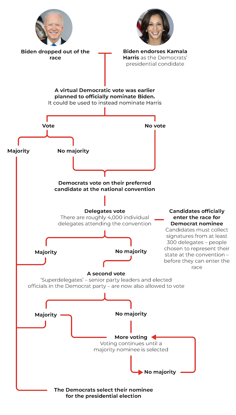 The Democratic party has around 4,700 delegates. Of these, around 3,800 delegates were pledged to nominate Biden for president and are now essentially free agents. Biden’s endorsement of Harris might convince some of them to support her bid, but they are under no obligation to do so.