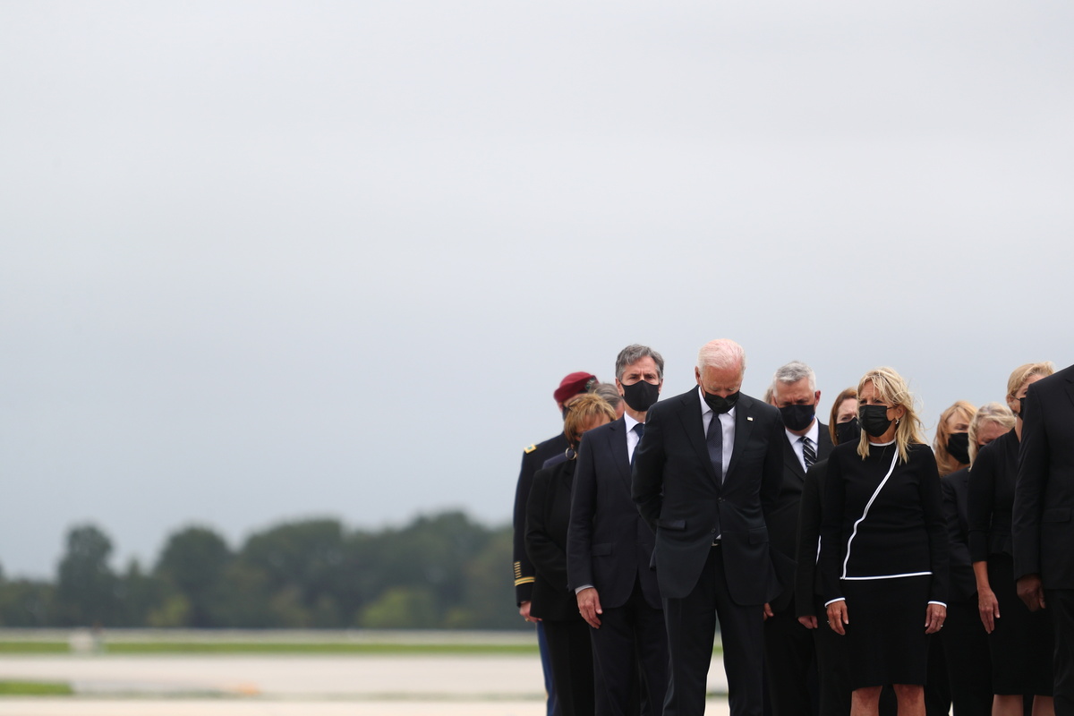 U.S. President Joe Biden shut his eyes and tilted his head back as the flag-draped cases carrying the remains of 11 American service members killed in a suicide bomb attack in Afghanistan emerged on Sunday from a military plane at a base in Delaware.