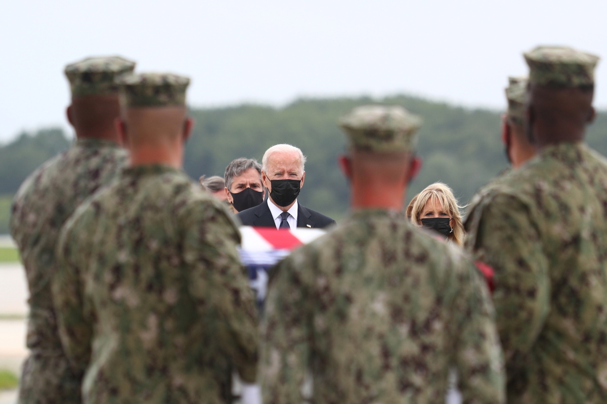 Biden, his wife, Jill, Defense Secretary Lloyd Austin and senior military officials stood somberly as U.S. troops carried the cases down the ramp of an Air Force C-17 aircraft at Dover Air Force Base. Crying could be heard and a woman collapsed as the remains were loaded into vans for transport to a facility where they will undergo identification and autopsies.