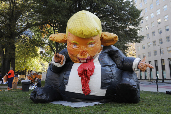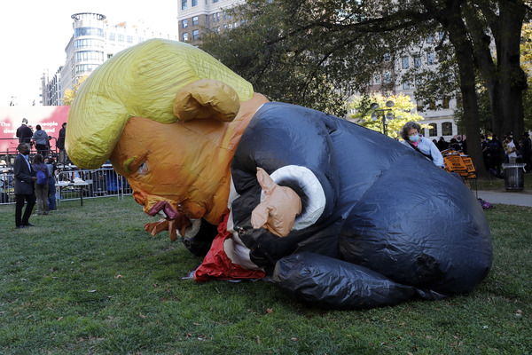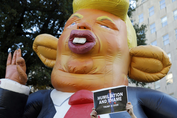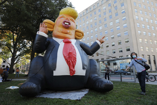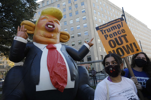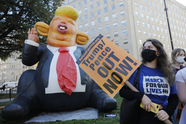 Celebrants stands next to an inflatable rat depicted as President Donald Trump after media announced Democratic nominee Joe Biden as President-elect during a watch party rally following the presidential election, near the White House in Washington, D.C., on Saturday, Nov. 7, 2020. (Yuri Gripas/Abaca Press/TNS)