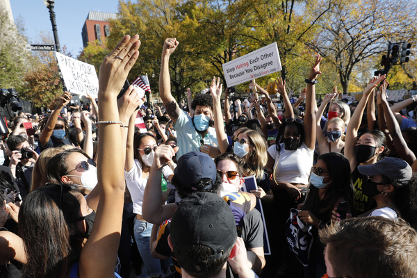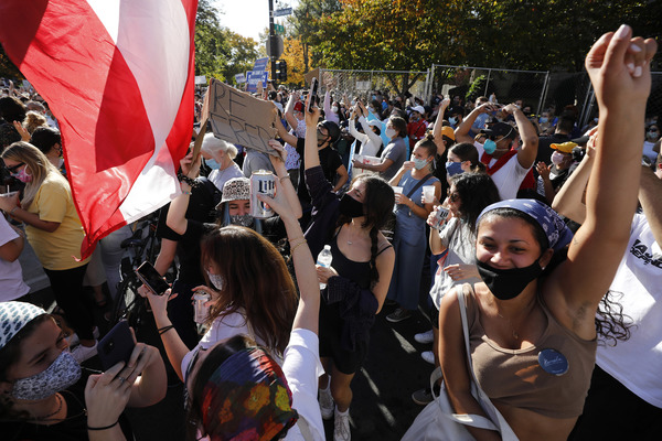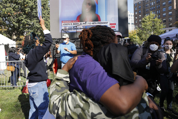 In New York, hundreds converged on Washington Square Park, a staging ground of protests over the past few nights, to cheer and wave Biden signs. Across downtown Manhattan, cars honked horns and diners clapped and stood up in their restaurant seats when news networks called the race.