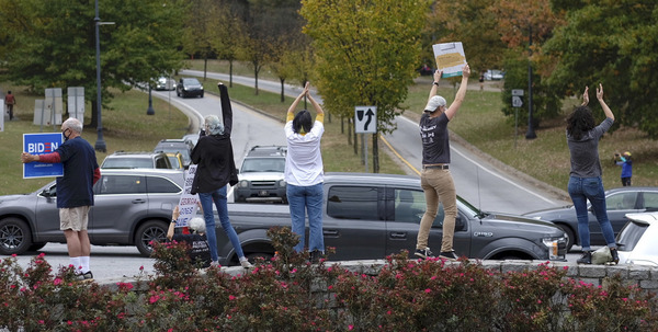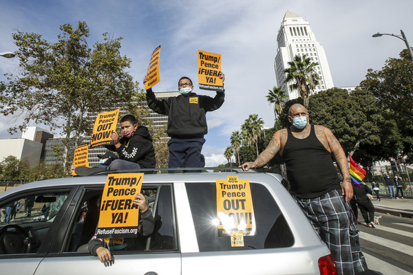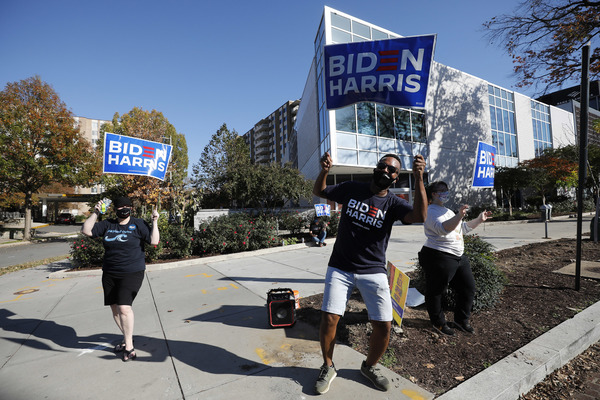 In Los Angeles, people stepped out of their homes to cheer on an unusually gray and chilly morning. Drivers honked and celebrities, including singer Lady Gaga and actress Kerry Washington, expressed support for Biden on Twitter. Kim Kardashian West, whose husband, Kanye, also ran for president, posted a picture of Biden and Vice President-elect Kamala Harris with three heart emojis.