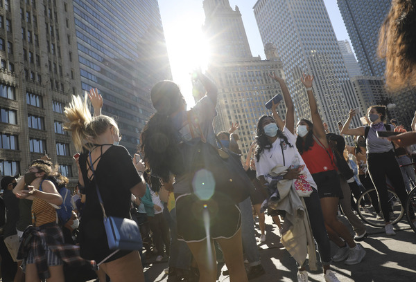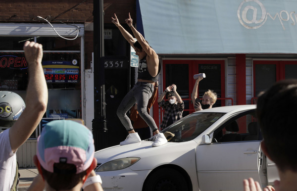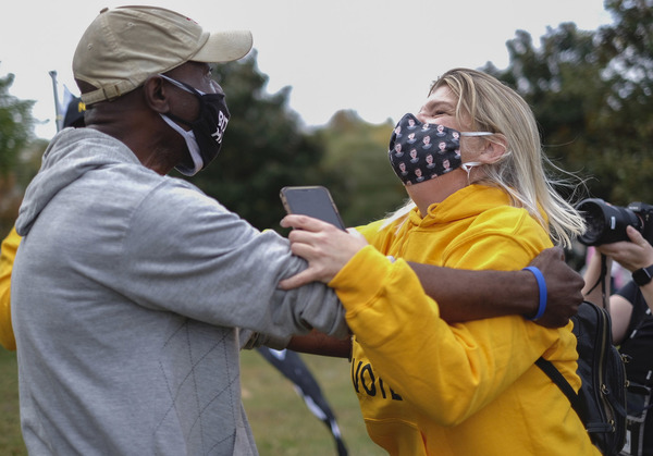 People in cars honked while friends hugged. At least two celebrators brought kitchen pots and cooking utensils to bang together. One woman had tears pouring into her face mask and a 20-something man dropped to his chest to do "the worm" across the intersection.