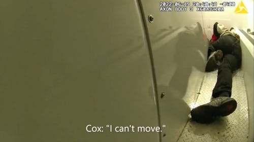 Cox, 36, was arrested June 19 on a weapons possession charge. Police footage of his arrest shows him handcuffed and placed in the back of police van, where he was launched, headfirst, into a wall when the officer driving the vehicle apparently braked suddenly. Despite telling the officers that “I think I broke my neck. I broke my neck. I can’t move,” Cox was nevertheless taken first to be booked at the local detention center where police ungracefully dumped his body in a wheelchair before he was subsequently taken for medical care at a nearby hospital. He eventually had surgery to fuse several broken vertebrae, per The New York Times.