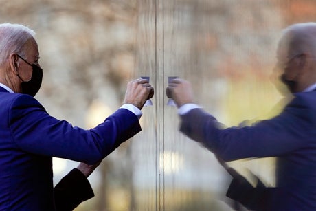 The Bidens made an unannounced trip and walked alongside one of the memorial's famed long black granite walls, polished to a high finish and etched with the names of more than 58,000 Americans who died in the war.
