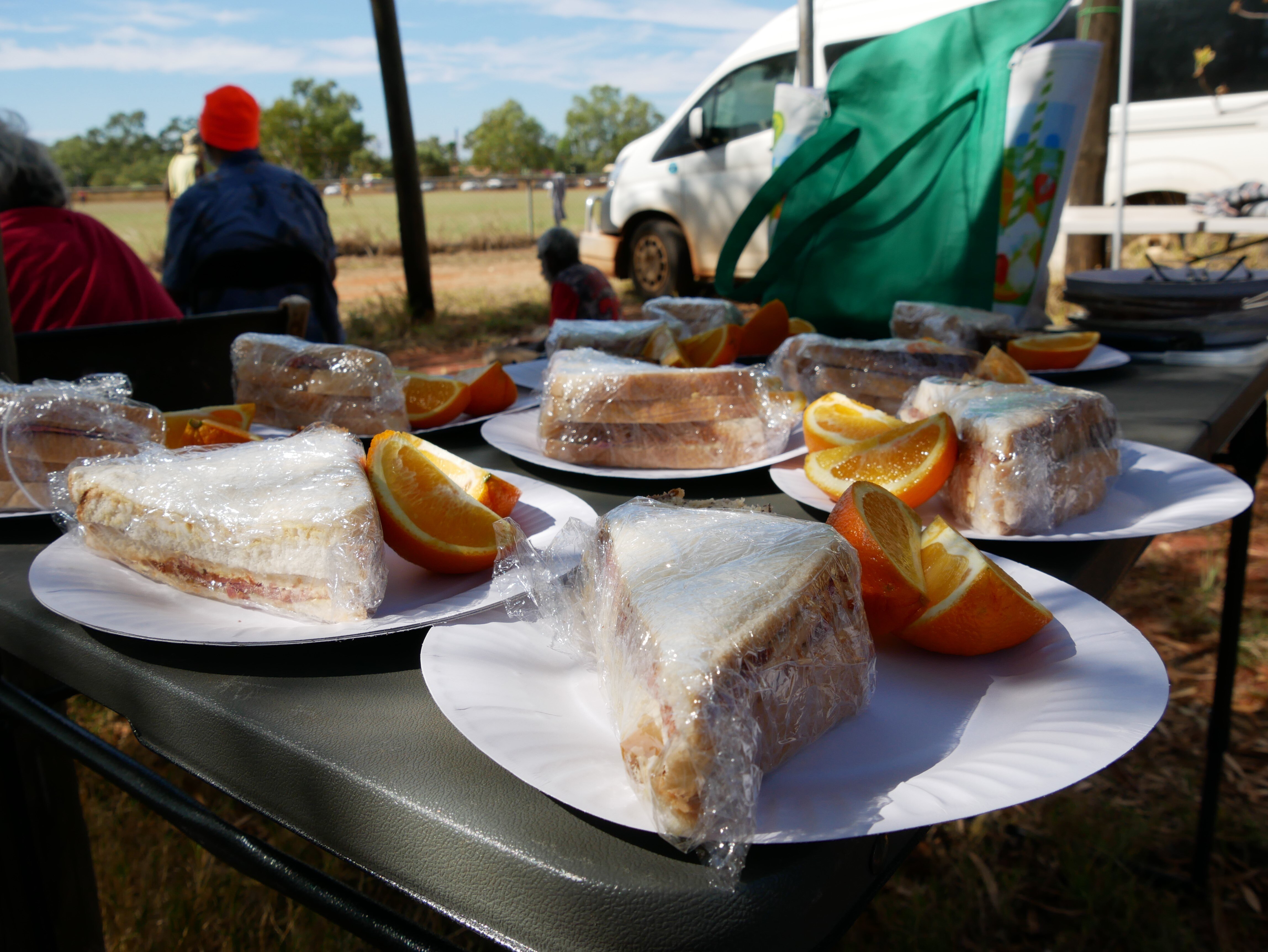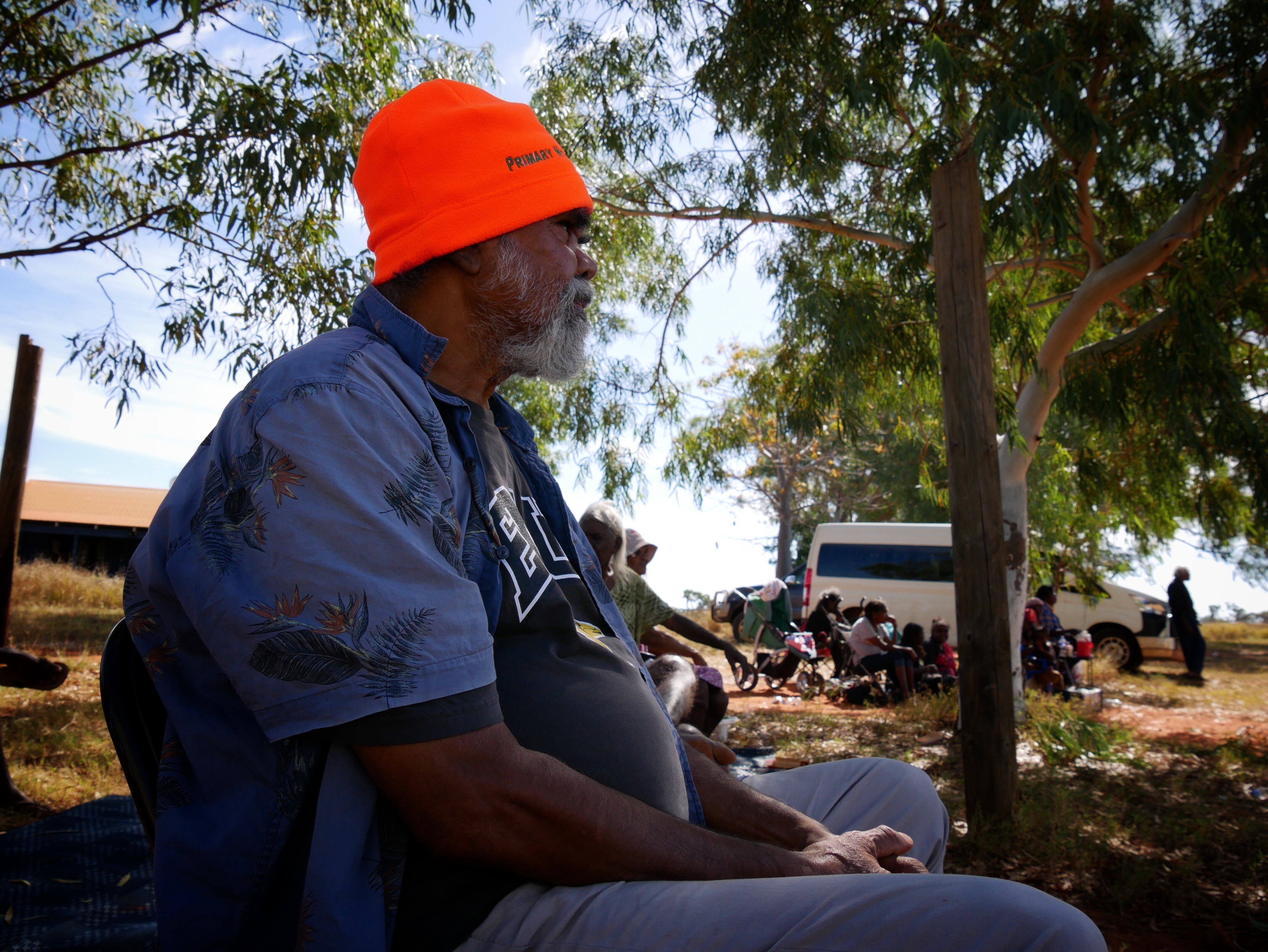 Elder Joseph Munroe, who once played for the Bidyadanga men's side, enjoyed a sandwich as he watched the game from a fold-out chair under the shade of a tree.