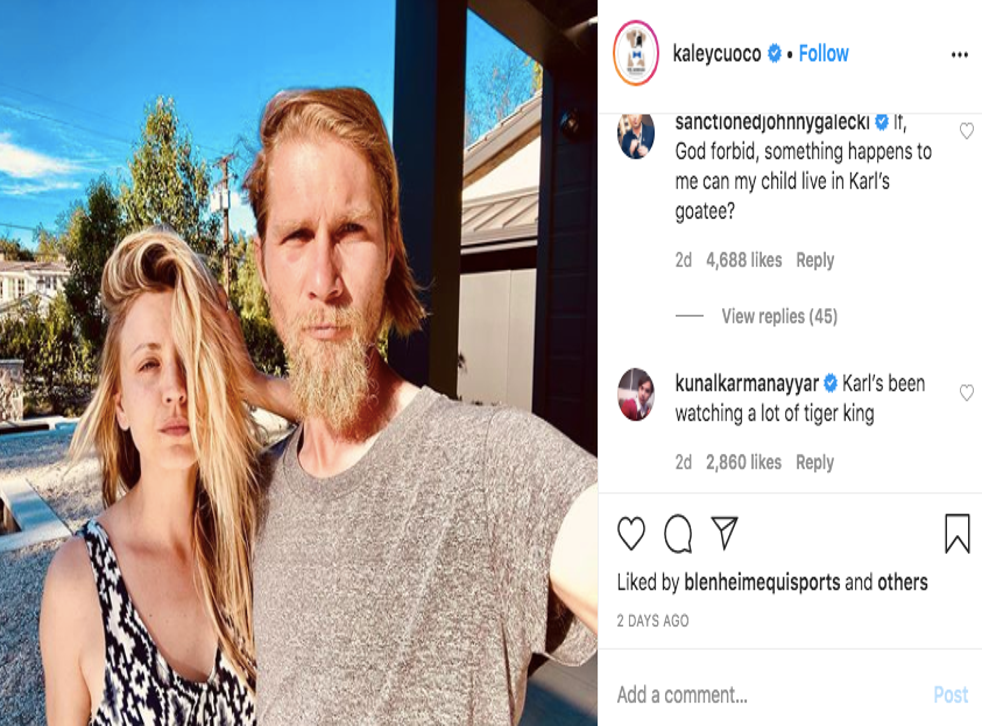 “Karl’s been watching a lot of Tiger King,” he quipped, hinting that Cuoco’s husband’s facial hair was inspired by controversial figure Joe Exotic.