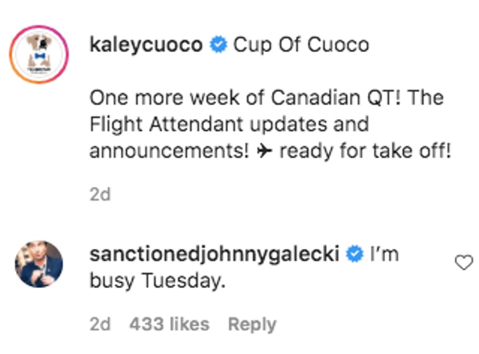 Galecki wittily responded: "I’m busy Tuesday," and Kaley – proving the pair are still friends – replied with the laughter emoji.