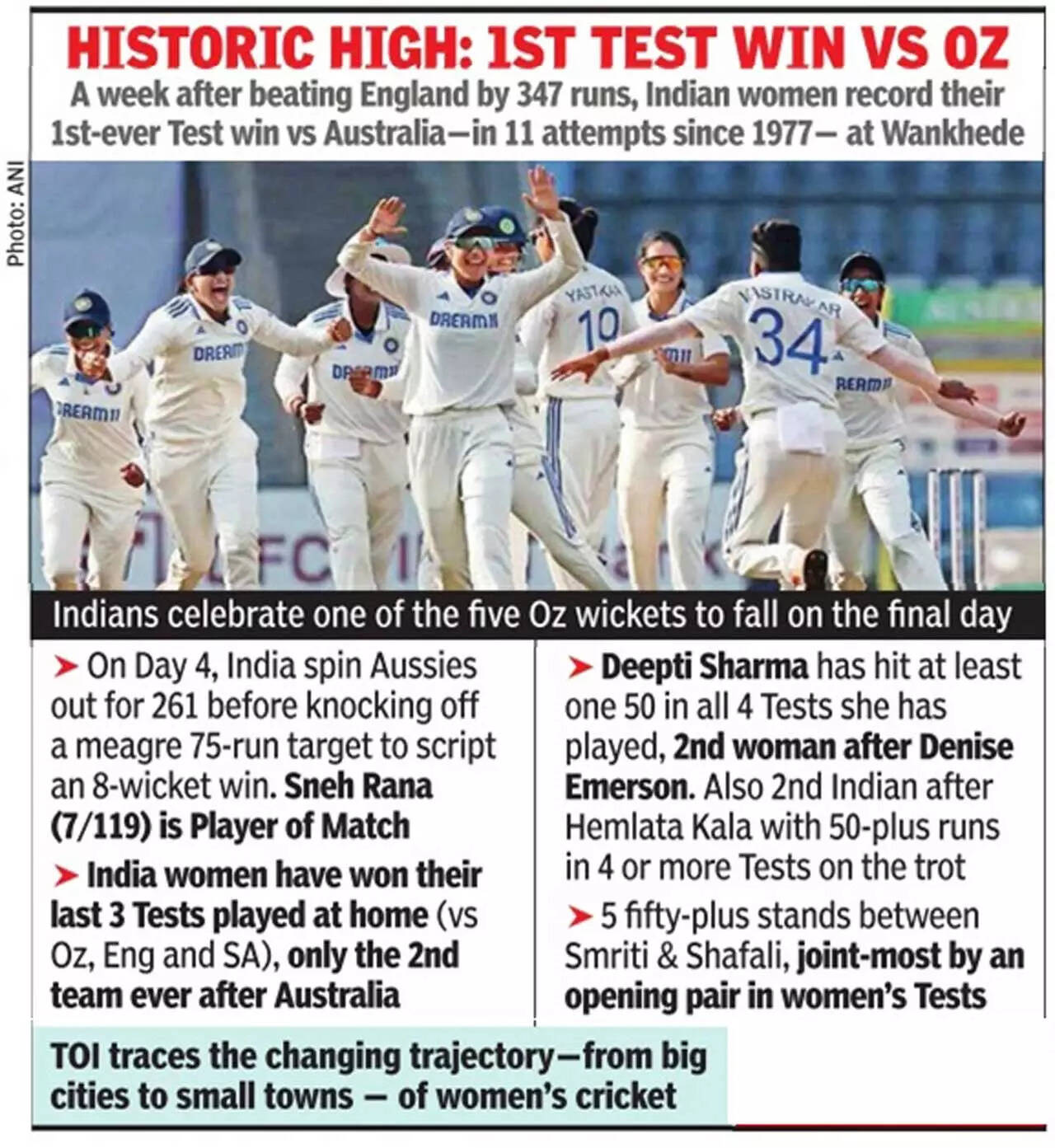 There's more. Even batting star Smriti Mandhana comes from Sangli in south Maharashtra. Player of the match Sneh Rana was born in Dehradun, pacer Renuka Singh belongs to Shimla and Deepti Sharma, India's premium all-rounder, learnt her cricket in Agra underlining the team's pan-India reach.