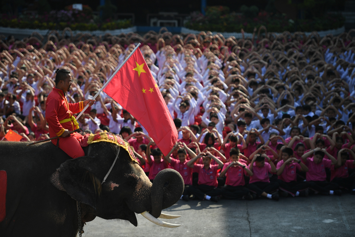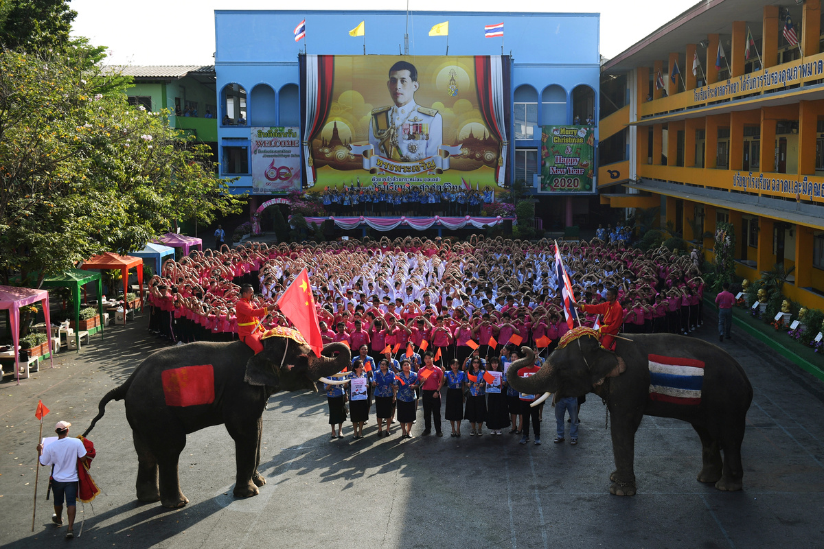 "China keep fighting," students and teachers of Jirasat Wittaya School chanted, as they stood with a pair of elephants in a heart formation in a courtyard.